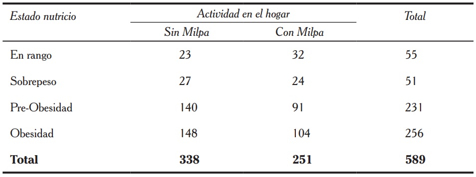 Siguiendo el marco conceptual, se elabora la relación entre el IMC y el consumo de agrodiversidad a través de la prueba Pearson Chi-cuadrado (cuadro 4), donde la hipótesis nula (H0) versa sobre la independencia entre las variables, estado nutricional en rango para hombres y cultivar Milpa. El resultado es estadísticamente significativo, r = 0.071; lo que sugiere rechazar H0, y aceptar la hipótesis alternativa (HA) sobre la dependencia entre el estado nutricional en rango y cultivar milpa.