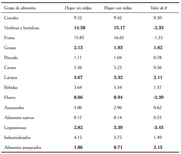 En el cuadro 5 se presenta la diferencia entre los hogares que cultivan y no Milpa sobre el promedio del número de alimentos por grupo. Destaca una diferencia estadísticamente significativa en verduras y hortalizas, huevo y leguminosas, todos ellos a favor del hogar que cultiva Milpa; mientras que, al lado contrario, los hogares que no cultivan Milpa, el grupo de grasas, lácteos y alimentos preparados. Esto es una muestra fehaciente de las preferencias de los consumidores; es decir, al pasar de la actividad agrícola ―por parte del jefe del hogar― a una actividad no-agrícola, hay una evidencia empírica en el patrón de consumo, por grupo de alimentos, estadísticamente significativa.