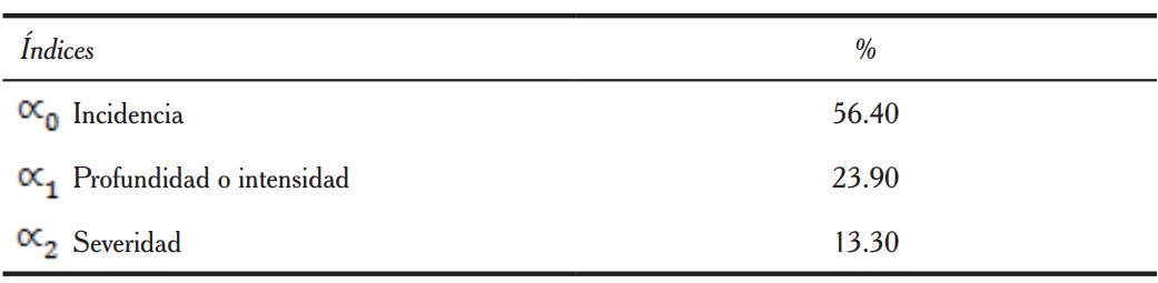 Además, se calcularon los indicadores de pobreza, desarrollado por Foster et al. (1984). Indicadores que pertenecen a la familia de índices Pα; a través de una sola cifra resumen y permiten identificar el nivel y la intensidad de la pobreza para todo un conjunto de población.