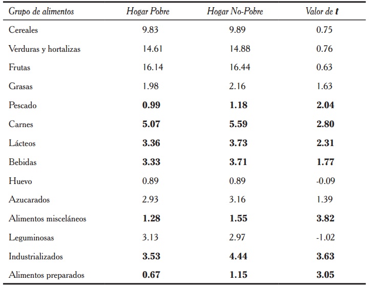 El cuadro 7 muestra la diferencia en el consumo de alimentos entre pobres y no-pobres. Los hogares bajo condición de pobreza extrema consumen menos alimentos del grupo de pescado, carnes, lácteos, bebidas, alimentos industrializados y preparados. Esto es una muestra fehaciente del objetivo planteado en este estudio, de la dependencia de los hogares inmersos en el fenómeno de la pobreza y la dependencia de la diversidad agrícola.