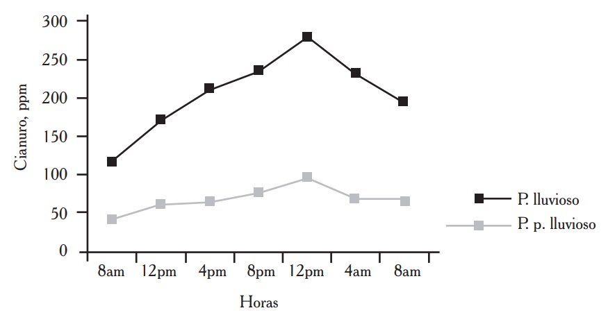 El contenido de cianuro no se considera un análisis de rutina en los laboratorios; pero por su importancia, cuando se emplean especies cianogénicas en la alimentación animal, se estudió su variación a través del día en Cynodon nlemfuensis (Aguilera et al., 1986). Los mayores contenidos se registraron en el horario nocturno y durante el período lluvioso se mostró superioridad comparado con el poco lluvioso (figura 1).