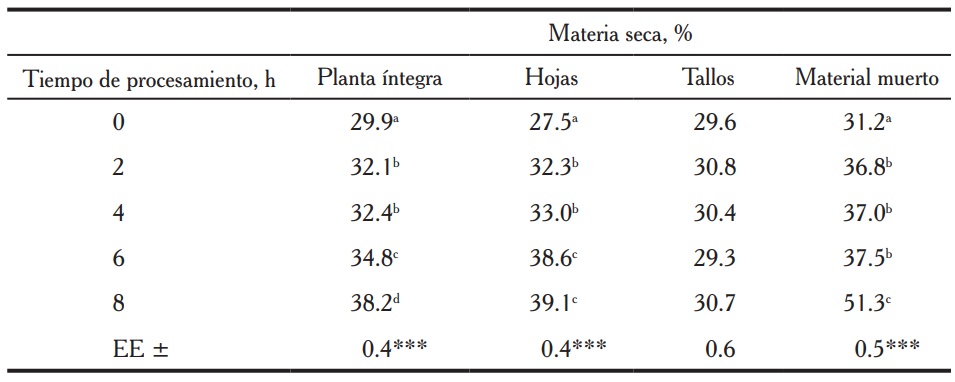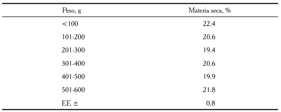 Martínez et al. (1989) no encontraron diferencias en el porcentaje de materia seca al evaluar distintos pesos de muestras de Pennisetum purpureum vc. Taiwán A-144 (cuadro 6). Además, argumentaron que el troceado de la muestra no mostró efecto positivo en el tiempo necesitado para su deshidratación.
