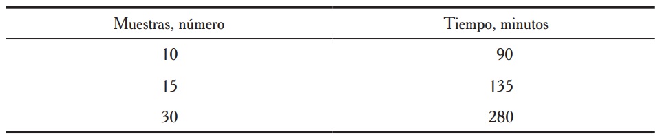 Como es lógico esperar, al aumentar el número de técnicos, se disminuye el tiempo de procesamiento de la muestra; por lo que Fortes et al. (2007) señalaron que un técnico puede demorar de 90 a 280 minutos (cuadro 10) en el procesamiento de 10 y 30 muestras, respectivamente; pero argumentaron que tiempos tan prolongados pueden ocasionar variabilidad en el resultado, debido al posible cansancio del técnico y a los cambios intrínsecos que sufre la muestra.