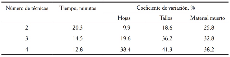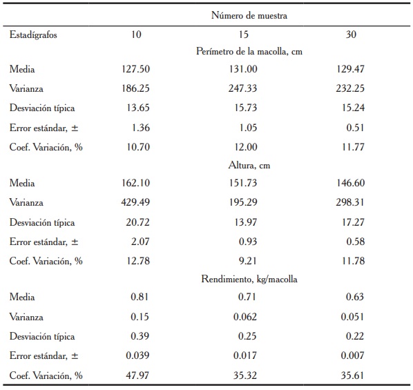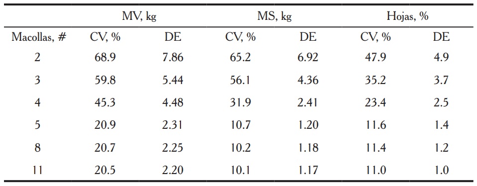 Estos autores recomendaron que es necesario muestrear no menos de cinco metros lineales, ya que fue donde menor coeficiente de variación se obtuvo; y, dentro de estos cinco metros, son suficientes cinco macollas tomadas al azar, ya que el coeficiente de variación y la desviación estándar se estabiliza a partir de ese valor.