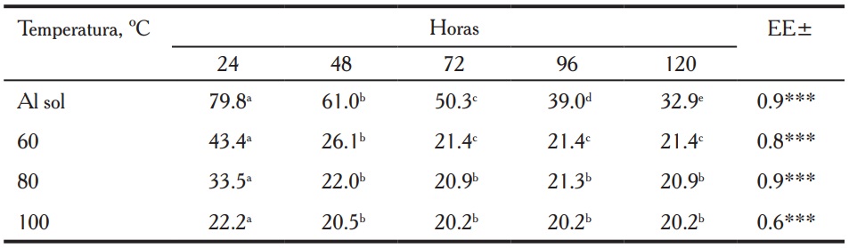 Estos autores señalaron que bajas temperaturas aumentan el tiempo requerido para el secado, así como pueden ocasionar reacciones internas; mientras que, altas temperaturas reducen el tiempo, pero pueden causar pérdida por volatilización y transformación de sustancias.