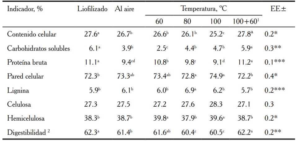 Con anterioridad, Herrera y Hernández (1987) habían realizado un estudio similar, pero relacionado con la composición química del pasto; y, además, incluyeron el secado por choque térmico (una hora a 100 ºC y después a 60 ºC hasta peso constante) y la liofilización (cuadro 13).