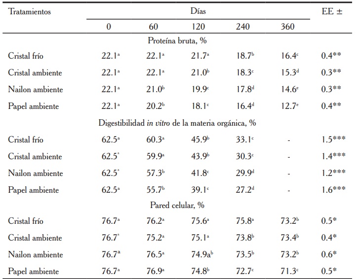 Ante esta situación, Herrera y Hernández (1987) condujeron un estudio para determinar la influencia del sistema y tiempo de almacenaje en la composición química del pasto. El tenor proteico disminuyó a partir de los 120 días, cuando se utilizó el almacenaje en frascos de cristal a temperatura ambiente; esta disminución fue la más marcada (a los 60 días), cuando se empleó el sobre de nailon o el de papel a temperatura ambiente. Esta situación es aún más crítica en la digestibilidad, pues la alteración comienza a partir de los 60 días; mientras que en la pared celular esa variación comienza a partir de los 120 días, con excepción del almacenado en sobre de papel a temperatura ambiente (cuadro 14).