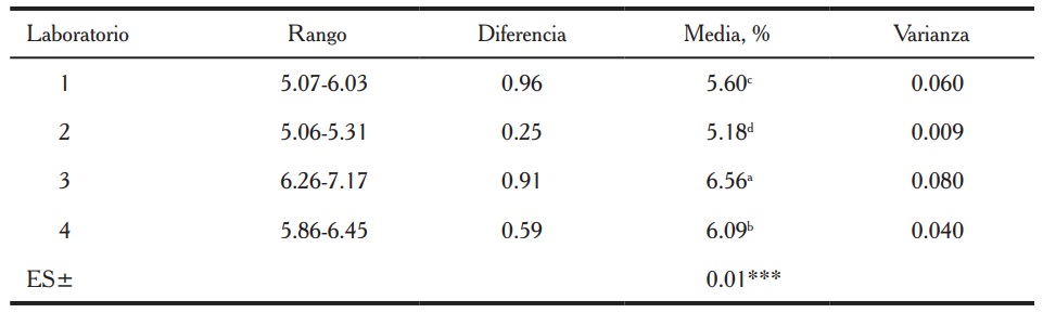 Otro elemento estudiado fue la variabilidad del resultado analítico entre cuatro laboratorios en Cuba dedicados al análisis químico del pasto. Se evidenció que, a pesar de existir diferencia significativa (P<0.001) en el porcentaje de proteína bruta, el laboratorio dos fue el mejor, debido a la menor varianza y menor amplitud del rango de valores (cuadro 16).
