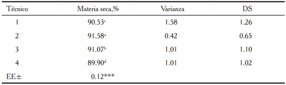 A partir de los resultados anteriores, se tomó como referencia el laboratorio dos y se estudió la variabilidad entre cuatro técnicos que realizan el análisis químico. El técnico dos, registró el mejor valor determinado por la menor varianza y desviación estándar (cuadro 17); lo cual pudo estar determinado por su preparación y calidad del trabajo realizado.