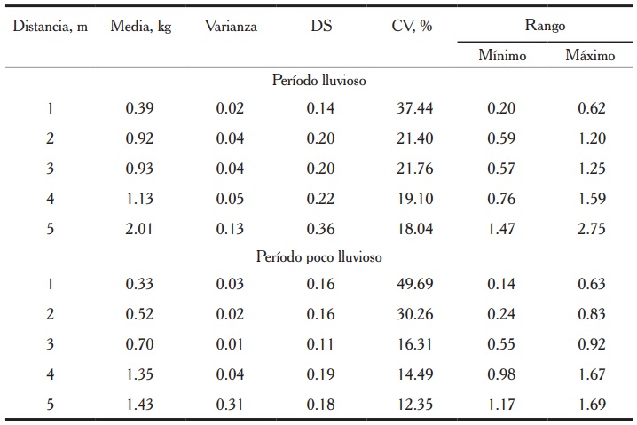 Con posterioridad, Herrera et al. (2013a, b) emplearon similar metodología, pero en áreas forrajeras de CT-115. Primero, determinaron la distancia que era necesaria muestrear (cuadro 2); y, dentro de ella, el número de macollas (cuadro 3) que representa el comportamiento de la población con relación a los indicadores, como: la altura, contenido de hojas y tallos, valor de la materia seca, población y rendimiento, entre otros.