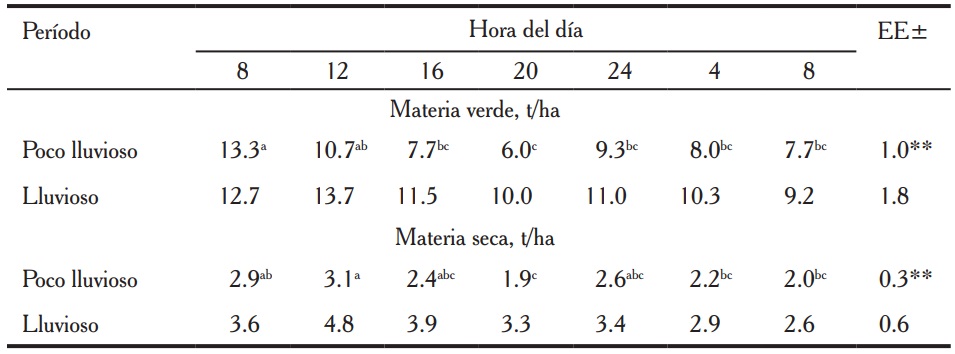 De todos es conocida la variabilidad de los factores climáticos (temperatura, luz, humedad, evaporación y velocidad del viento, entre otros) a través del día. Ante esta situación, se estudió el comportamiento de algunos indicadores agronómicos y de calidad de Cynodon dactylon vc. Coast cross 1, cuando se muestreaba en distintas horas del día; así, Hernández y Herrera (1985) encontraron que los mayores (P<0.01) rendimientos se hallaron en las primeras horas de la mañana del período poco lluvioso; mientras que en el lluvioso esa variabilidad no fue significativa (cuadro 4); aunque, en ambos casos, los menores valores se registraron en el atardecer y altas horas de la noche.