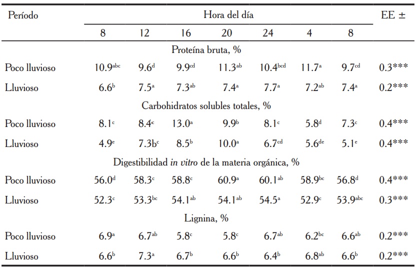 Cuando estos autores estudiaron la composición química, encontraron que en ambos periodos estacionales el tenor de proteína bruta varió (P<0.001) con el horario de muestreo y los mayores valores se registraron en el horario nocturno; el mayor contenido (P<0.001) de carbohidratos solubles totales se alcanzó a las 20:00 horas, en el período lluvioso; mientras que en el poco lluvioso se obtuvo a las 16 horas. La digestibilidad in vitro de la materia orgánica mostró comportamiento variable al igual que la lignina (cuadro 5).