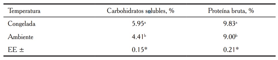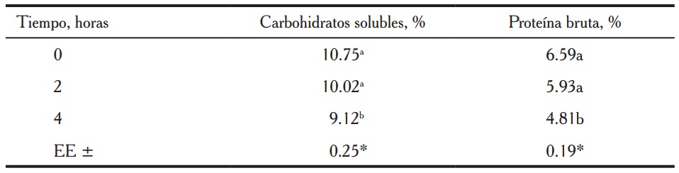 Ante esta situación, Herrera (1974) informó que el contenido de carbohidratos solubles y proteína bruta disminuían, así como otros componentes químicos también sufrían alteración, cuando la muestra después de tomada se mantenía a temperatura ambiente (cuadro 7).