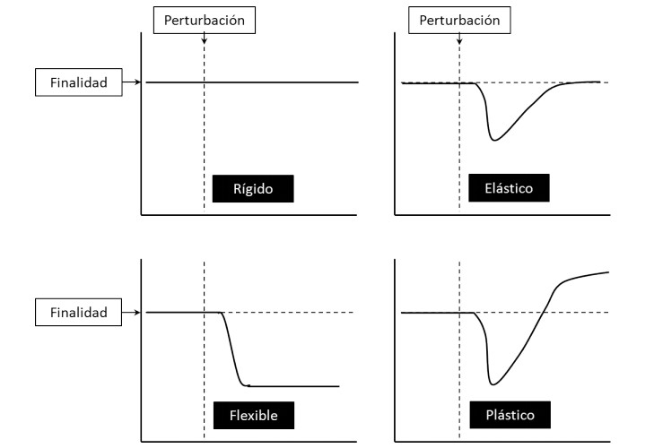 Los sistemas elásticos, en cambio, se adaptan modificando transitoriamente su estructura, y su resiliencia es proporcional al grado de su máxima deformación. Sin embargo, su finalidad no se modifica, por lo que se habla de estabilidad teleonómica (Monod, 1970). La homeostasis, pone en práctica las propiedades elásticas de los seres vivos frente a las perturbaciones a las que se enfrenta. De manera similar, las adaptaciones “tácticas” de los sistemas a veces conducen a propiedades elásticas.