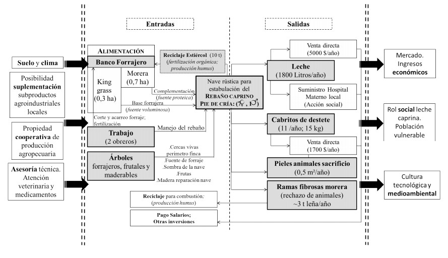 Los ingresos económicos y los reciclajes que se producen en el sistema se generan a partir de las producciones de leche, de cabritos de destete, de leña a partir de los residuos fibrosos de morera, de pieles y de estiércol (figura 3).