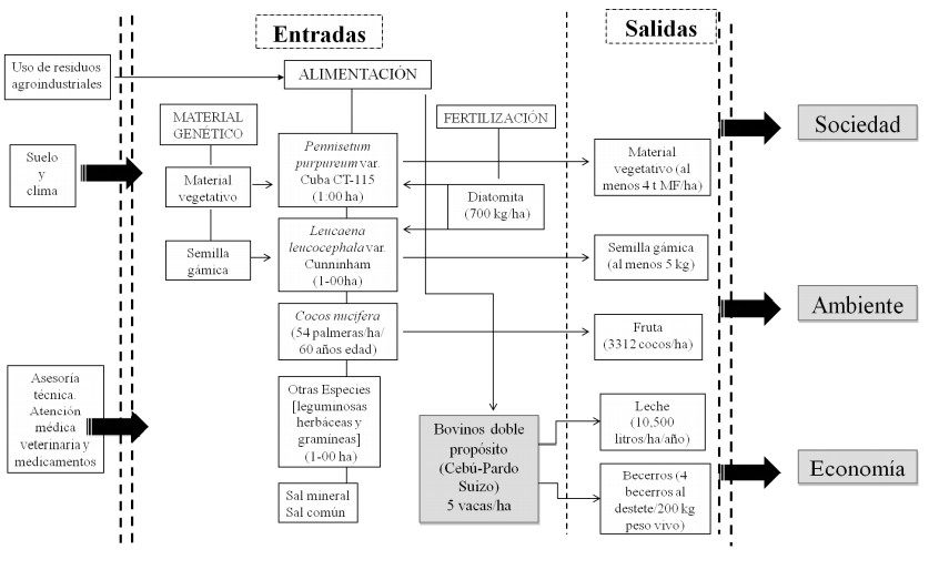 Frutos: además de la leche y la carne generada en el sistema, se considera la producción de frutos de palma (Cocos nucifera) con un promedio de 3,312 frutos/ha/año.