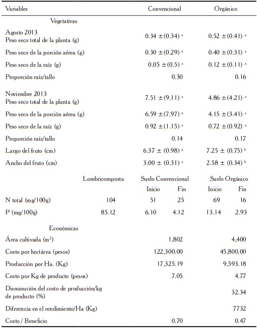La biomasa seca de las plantas de ambos tipos de manejo no difirió significativamente; mientras que la longitud del fruto fue mayor en el cultivo orgánico y el ancho del fruto en el convencional (cuadro 1); datos similares se han reportado en otras investigaciones (Azadi et al., 2011; Seufert et al., 2012), donde señalan una mejora sustantiva en la calidad del producto agrícola mediante un manejo orgánico.