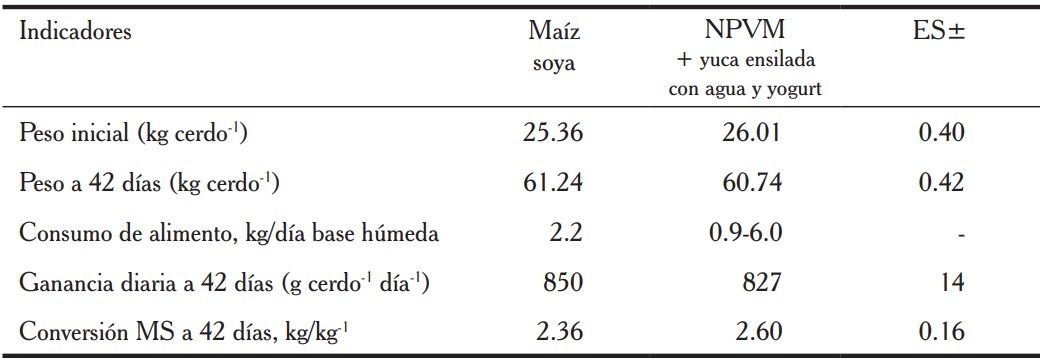 Los indicadores del comportamiento animal para el peso inicio, final, ganancia diaria y conversión alimenticia en la primera prueba, aparecen en el cuadro 1. No se encontraron diferencias significativas para ninguno de los indicadores medidos, lo que demuestra que la yuca ensilada en forma líquida, por este método, es capaz de sustituir eficientemente toda la energía del maíz en cerdos en crecimiento, independientemente del alto potencial de crecimiento que tengan los animales, como se demuestra en este caso.