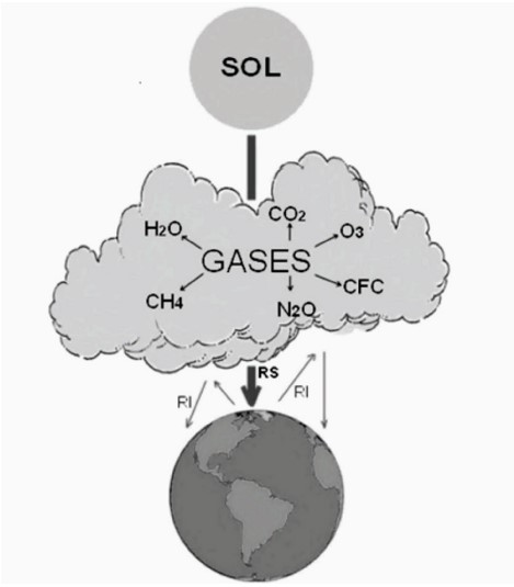 NOTA: El sol emite Radiación Solar (RS), de onda corta, que calienta la Tierra. La energía recibida vuelve para la atmósfera como Radiación Infrarroja (RI), de onda larga; cuando encuentra la nube de gases, vuelve para la superficie de la Tierra y provoca excesivo calentamiento, es el EI. Los principales gases del EI son: CO2, vapor de H2O, CH4, O3, CFC y N2O. El incremento de gases en la troposfera se debe a las actividades humanas.