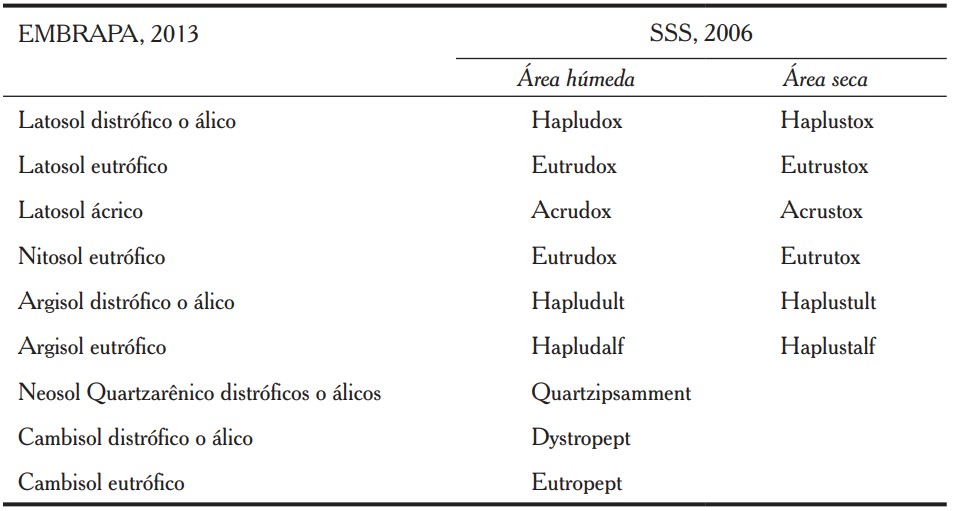 En Brasil, existen nueve tipos de suelos (cuadro 1) donde se cultiva la caña de azúcar (EMBRAPA, 2013; Prado, 2013), con su correspondiente nomenclatura, según la SSS (2006). Aunque, la clase Latossolo eutrófico y Nitossolo eutrófico, corresponde a la misma clase Eutrudox y Eutrutox. Asimismo, existen estudios de las principales características climáticas que los diferencian (Biswas, 1986; Marín, 2011; EMBRAPA, 2012; Brasil, 2013).