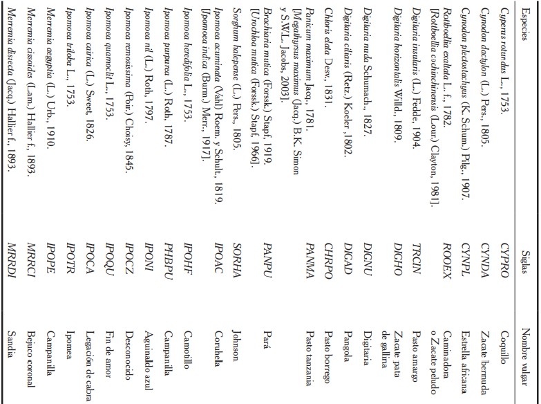 Todas las normas de taxonomía son regidas por el ICN. Sin embargo, existe desacuerdo en algunos nombres científicos de nomenclatura (Missouri Botanical Garden and the Royal Botanic Gardens, Kew, 2010; Linnaeus, 1782; USDA-United States Department Agriculture, 2013). Ya que, algunos autores consideran que el nuevo es el mejor. Esto ha causado una verdadera confusión en la bibliografía internacional. Las peores arvenses se encuentran ampliamente distribuidas en el mundo (Arévalo y Bertoncini, 2008; Holm et al., 1977; Rochecouste, 1967) y en toda el área cañera de Brasil (cuadro 2).