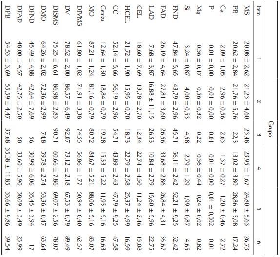 Y en el séptimo grupo, la Neonotonia wightii, con las menores concentraciones de PB, Mg, CC, DIVMS, DV, DMO, DFND, DFAD, y los mayores de FAD y CEL.