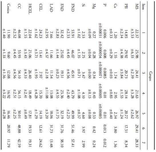 Posteriormente, se molieron hasta el tamaño de partícula de 1 mm y se almacenaron en frascos ámbar, hasta el momento del análisis. Se cuantificaron: la proteína bruta (PB) por el método Kjeldhal, la ceniza, calcio (Ca), fósforo (P), magnesio (Mg), sílice (Si) y materia orgánica (MO), de acuerdo con AOAC (2000); mientras que la fibra neutro detergente (FND), fibra ácido detergente (FAD), lignina ácido detergente (LAD), celulosa (CEL), hemicelulosa (HCEL) y contenido celular (CC), según Goering y Van Soest (1970).