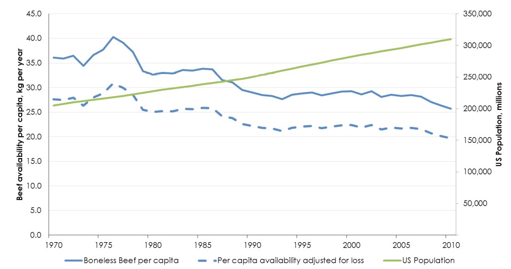 Another often over-looked aspect to US beef’s sustainability is food waste. Total edible beef losses from retail, foodservice, and consumers in the US are estimated to be 16 % (Kantor et al., 1997). The losses of boneless beef estimated by the USDA Economic Research Service can been seen in figure 1. Reducing losses of edible beef could potentially greatly enhance the sustainability of the US beef industry, when considering the environmental, economic, and social impacts of beef production per unit of edible beef consumed. Edible beef waste represents a loss of all its human nutritional value and means all the feed, energy, water, etc. required to produce the wasted beef has been used for naught. Reducing losses could potentially help provide nutrients to food insecure people (49 million Americans in 2012; Coleman-Jensen et al., 2013).