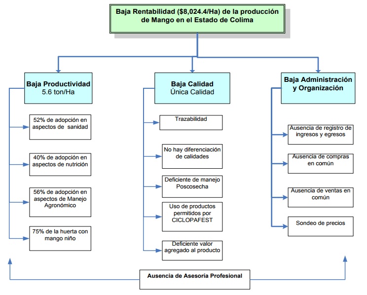 Con la finalidad de plasmar los problemas y causas de la problemática de la baja rentabilidad de los productores de mango, se presenta la figura 1, en donde se destacan los siguientes aspectos: