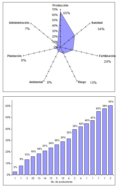 Como se observa en la figura 3, esta brecha es alta; sobre todo, en las categorías administrativas, de plantación, ambiental y de riego (cuyos porcentajes oscilan entre el 7 al 13% de los indicadores) y, en menor medida, en la fertilización y sanidad.