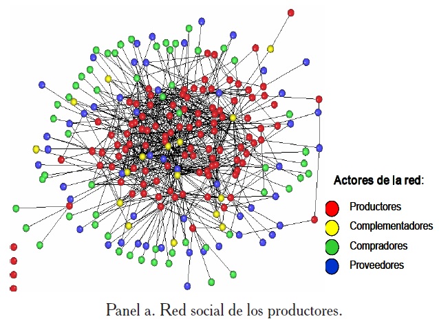 Todos los seres humanos vivimos e interactuamos con otros seres humanos. Así que, las relaciones sociales de los productores se realizan con otros productores, con los comercializadores, proveedores de insumos, técnicos, líderes de organizaciones, funcionarios, etcétera (figura 4, panel a). De estas relaciones es como circula y se aprende información para la producción, opciones de venta, la competencia, nuevos negocios. Nótese, sin embargo, que en la figura mencionada existen productores que trabajan aislados; esto es, que no son referidos por otros productores.