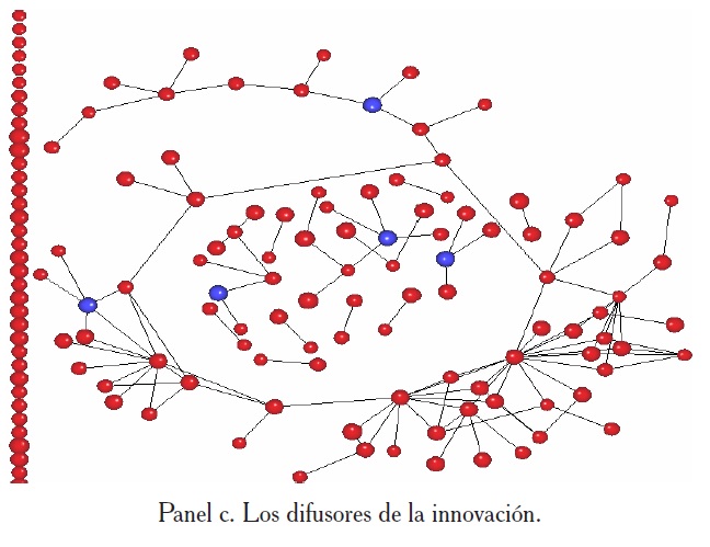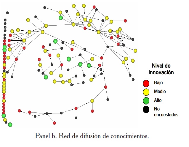 La metodología de redes considera a estas relaciones sociales y crea mapas de ellas, con lo cual es posible saber cuáles productores son más comunicadores; o bien, los aislados, los innovadores y dispersores de información, los egoístas que absorben información pero no la comparten, etcétera. El panel b de la figura 4 muestra gráficamente cuáles productores, además de estar bien comunicados con otras personas o productores, tienen determinado nivel de adopción de innovaciones.