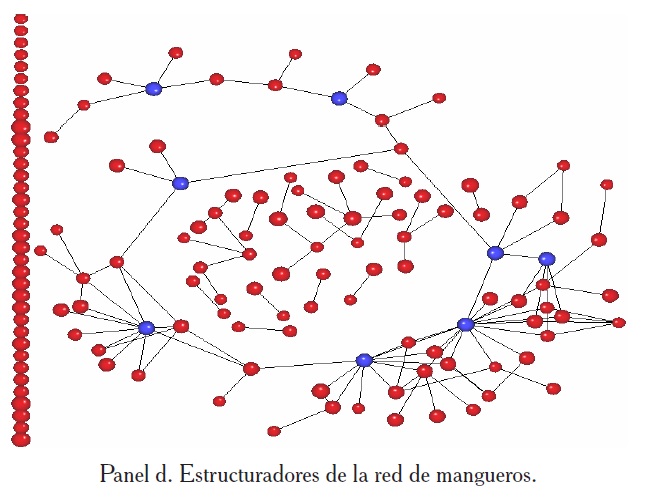 Esto es lo que muestran los paneles c y d, de la figura 4. Algunos productores son los difusores de su red social; es decir, aquellos productores más referidos (por otros productores) como “los que no se guardan sus secretos”, sino todo lo contrario: cualquier innovación que tenga resultados (tanto productivos como económicos) la comunican a los miembros de su comunidad o grupo de amigos. Los estructuradores son también referidos como aquellos en quien otros productores tienen confianza, y permiten o facilitan la estabilidad de la red social: promueven juntas, reuniones, así como la colaboración con otras personas, autoridades locales, proveedores, etcétera.