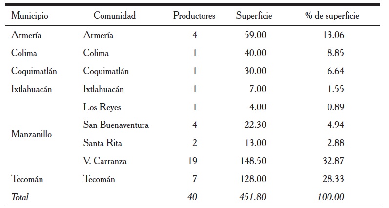 En el cuadro 2, se muestra el lugar de residencia y la superficie de cultivo de los productores de mango. Es importante destacar que con estos productores de la red se espera influir en al menos otros 40 productores; quienes, de acuerdo con los resultados de la primera etapa, toman como referencia a los productores innovadores y difusores.