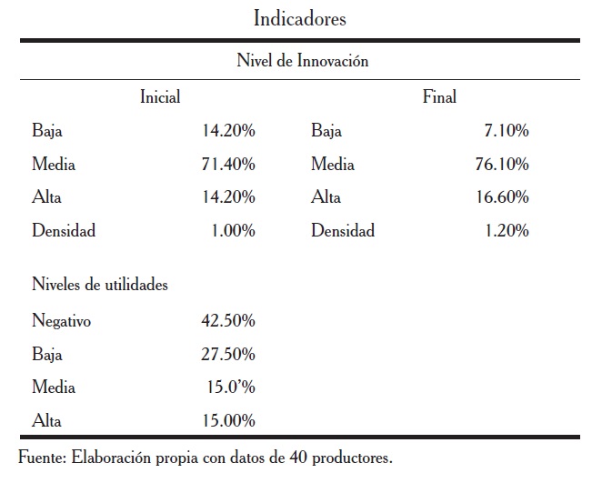 Sin embargo, el cambio más importante fue para los productores con bajo nivel de adopción, quienes constituían el 14.20% al inicio del proyecto y bajaron al 7.10% al final. Estos cambios pueden juzgarse como modestos, debido a que las innovaciones en ocasiones representan inversiones en las UPR. Variables económicas como bajos ingresos (por bajos rendimientos o bajos precios) son la explicación más factible para esta situación.