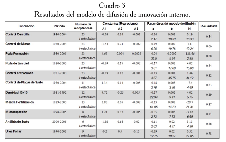 Finalmente, el parámetro Ñ refleja el posible número de adoptantes en el sistema y el grado de difusión; en este sentido, los resultados obtenidos son heterogéneos por el hecho de que existen innovaciones en donde el número de adoptantes es negativo. Tal es el caso de las innovaciones en la poda de formación, control de plagas de suelo, mezcla de fertilización, y micro-aspersión.