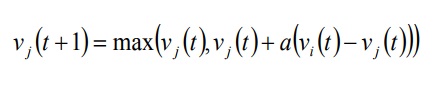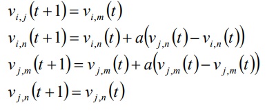 Si j es un agente vecino de i e i es el agente innovador, i entonces transmite el conocimiento a j .Para el agente j se incrementa su stock de conocimiento: