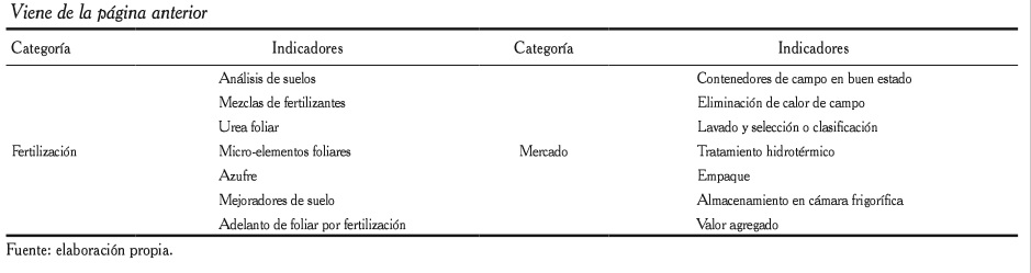 Se utilizó un cuestionario que fue validado por el Consejo Estatal de Mango de Colima (COEMANGO) y aplicado en la primera etapa de este proyecto en 2007, para un conjunto de 115 productores (González, 2007). Las categorías e indicadores aparecen en el cuadro 1.