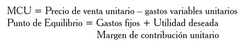 Para estimar el punto de equilibrio, por el método de margen de contribución unitario (MCU) o de utilidad marginal (Anon., 1992), donde:
