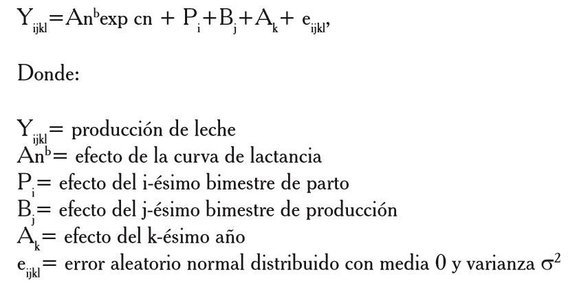 La producción de leche y el porcentaje de grasa, se analizó por un modelo multiplicativo (Menchaca, 1978), con los efectos: bimestre de parto y de producción, año y número de lactancia; los datos fueron transformados a logaritmo natural.