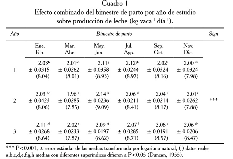 Los análisis de las producciones de leche arrojaron que existió interacción (P<0.001), tanto entre los bimestres de producción como de parto, con los años en estudio.