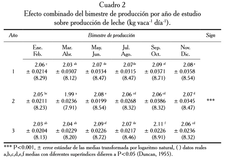 La interacción (P<0.001) de los bimestres de producción por años en estudios (cuadro 2), muestran una estabilidad en el sistema de alimentación, ya que no difieren los últimos cuatro bimestres del año; sólo se mostraron las menores (P<0.001) producciones en los primeros dos bimestres (enero-febrero y marzo-abril), que no difieren entre sí; como promedio estos dos primeros bimestres produjeron 4.54% menos leche que los restantes cuatro.