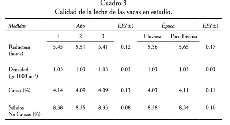 La calidad de la leche fue similar entre años (cuadro 3) y mantuvo, en sentido general, valores altos para el tipo de dieta donde el forraje de caña predomina. De igual forma, la calidad higiénica de la leche con el régimen de estabulación fue alta, los tiempos de reductasa (reacción del azul de metileno), como promedio de cada año, fueron superiores a las cinco horas y media (5.30), lo que clasifica como leche de muy buena calidad sanitaria (cuadro 3).
