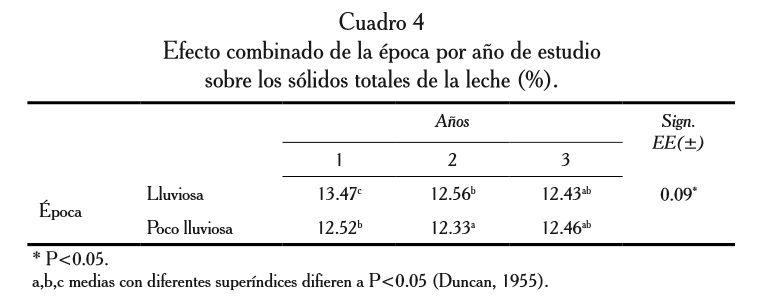 Sólo los sólidos totales (ST), fueron afectados significativamente por la interacción (P<0.05), año/época, mostrando en la época lluviosa mayores niveles en los dos primeros años 7.60 y 2.80%, en comparación con el periodo poco lluvioso (cuadro 4).