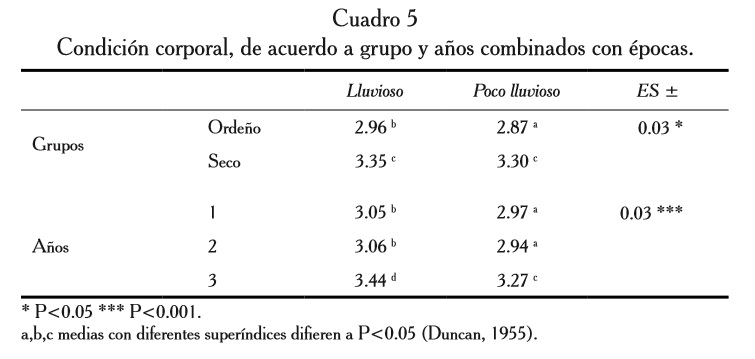La interacción época/año (P<0.001), mostró en todos los años, que en la época de lluvia se reflejaron las mayores CC, como promedio en 3.92 % más que en la poco lluviosa, estando acorde a las mejoras en los niveles de alimentación en esta época (cuadro 5).