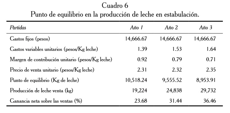 En el análisis del punto de equilibrio de la producción de leche en condiciones de estabulación (cuadro 6), se aprecia que los gastos variables unitarios se incrementan en un 10.10 y 17.90% en el segundo y tercer año con relación al primero, respectivamente; lo cual está motivado por el incremento de la alimentación y salarios, ya que todas las acciones desarrolladas en la unidad fueron manuales (ordeño, corte de forraje, molinaje, atención animal, etcétera). El margen de contribución unitaria se disminuye en un 14.30 y 22.80% en igual comparación de periodos que el anterior indicador.
