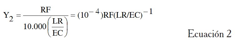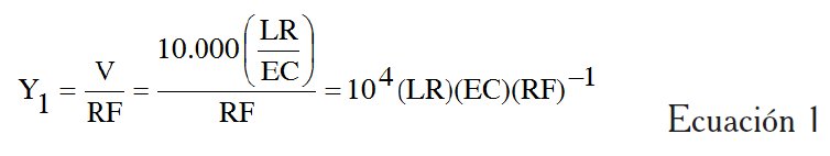 La variable Y1, muestra la relación entre el volumen (V) de agua que representa la demanda hídrica del cultivo en una hectárea (en m3) y el rendimiento físico “RF” por hectárea del cultivo (en kg). Donde “V” es el producto de 10,000 m2 por la lámina de riego “LR” (en m) dividida entre el coeficiente de eficiencia de conducción “EC” (en porcentaje, en base 1). Se expresa en metros cúbicos de agua empleados en el riego por kilogramo de durazno.
