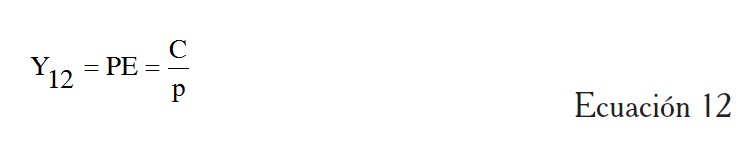 La variable Y12, determinó el punto de equilibrio “PE”, igual a la división del costo por hectárea (C) entre el precio por tonelada (p) señalado en ecuaciones 3 y 5. Lo anterior tiene su sustento en considerar que el PE es el punto donde el ingreso monetario por hectárea “RM = Rf (p)” es igual al costo por hectárea (C), por lo que al igualar RF (p) con C y despejar RF, queda tal cual se señala abajo la Y12. Se expresa en toneladas por hectárea.