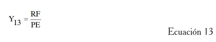 La variable Y13 es adimensional, ya que es una relación entre el rendimiento físico por hectárea (RF) del cultivo entre el punto de equilibrio (PE), dado por Y12, de tal forma que si Y13 es mayor a la unidad, el productor puede cumplir un crédito productivo, pues geométricamente se ubica en la zona de ganancia; y si Y13 es menor a la unidad, es vulnerable, ya que su producción no alcanza para cubrir los costos generados; por ello, es que Y13 mide cuán vulnerable es el productor a la obtención, o no, de un monto crediticio para llevar a cabo la producción.