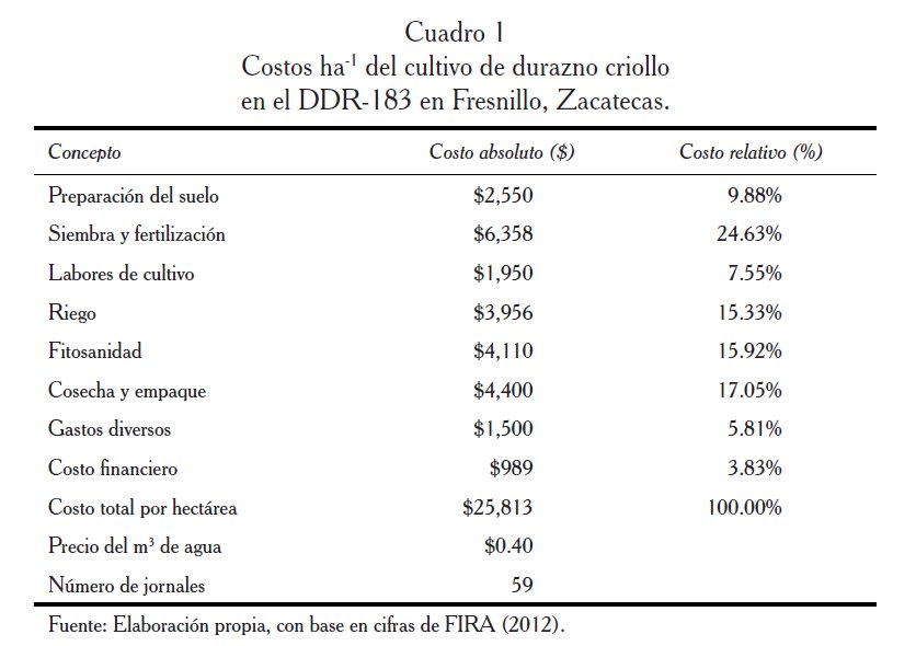 Por otra lado, los costos por metro cúbico observado en esta área fueron muy bajos ($0.40 m-3), comparados con otras áreas productoras de durazno (en Murcia, España), donde el costo es de € 0.21 m-3 (lo que equivale a $ 3.94 m-3) (Salvador et al., 2011).